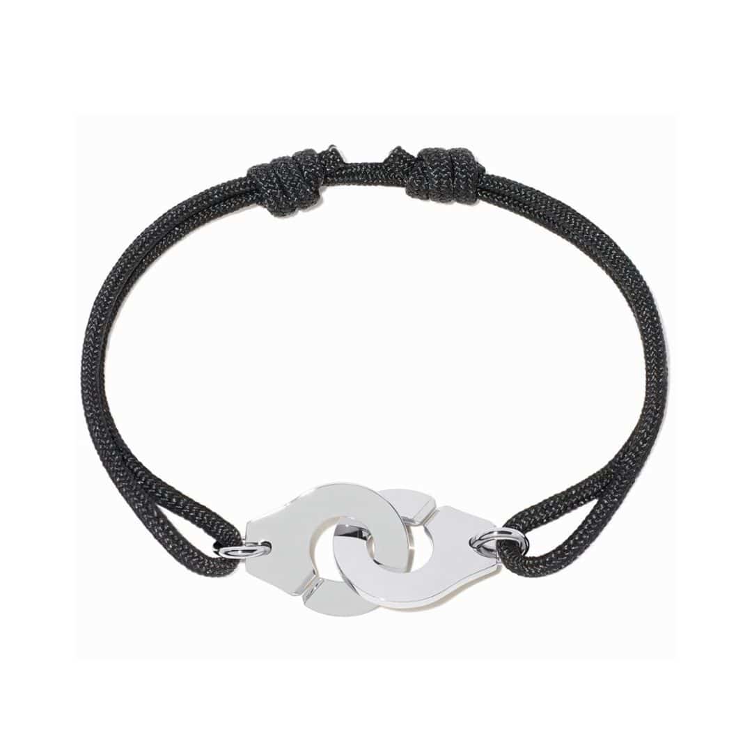 Brazalete Menottes Dinh Van en platino con cordón, modelo grande. Inspirado en las icónicas Menottes, combina flexibilidad y movimiento con un simbolismo de fuerza y longevidad. Cordón ajustable con nudo deslizante, disponible en varios colores. También disponible en otras tallas, en oro o con diamantes según el modelo.