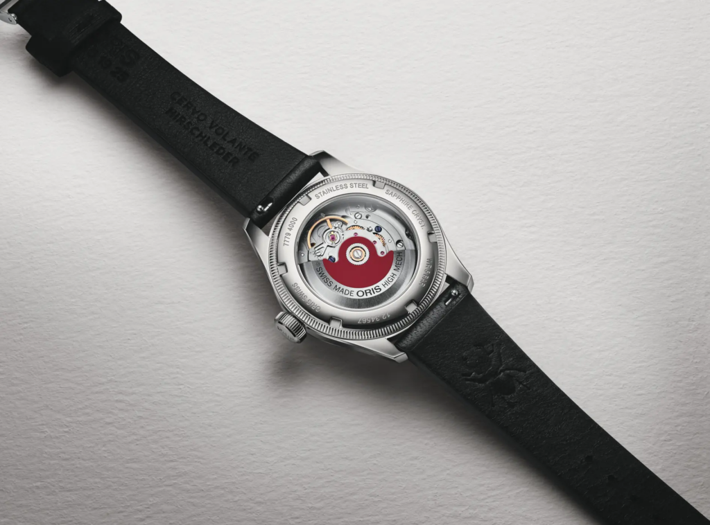 El Big Crown Pointer Date “Bullseye” reflecteix clarament el compromís d’Oris amb la precisió mecànica i la tradició de la rellotgeria suïssa. En primer lloc, el rellotge està equipat amb el calibre automàtic Oris 754, basat en Sellita, que incorpora la característica complicació pointer date amb maneta central. A més, el moviment presenta el distintiu rotor vermell de la marca, un element emblemàtic dins de l’univers Oris. D’aquesta manera, cada moviment combina fiabilitat, precisió i facilitat de manteniment. Finalment, el vidre de safir doblement bombat protegeix l’esfera i reforça un disseny que, en conjunt, respira autenticitat i elegància atemporal.